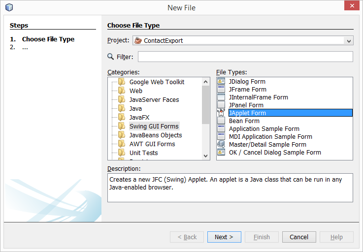 Step 2. Create a JApplet. Create a new JApplet form in the com.example package called ContactExport. This allows us to use the GUI builder in NetBeans which can greatly simplify designing a Swing-based user interface.